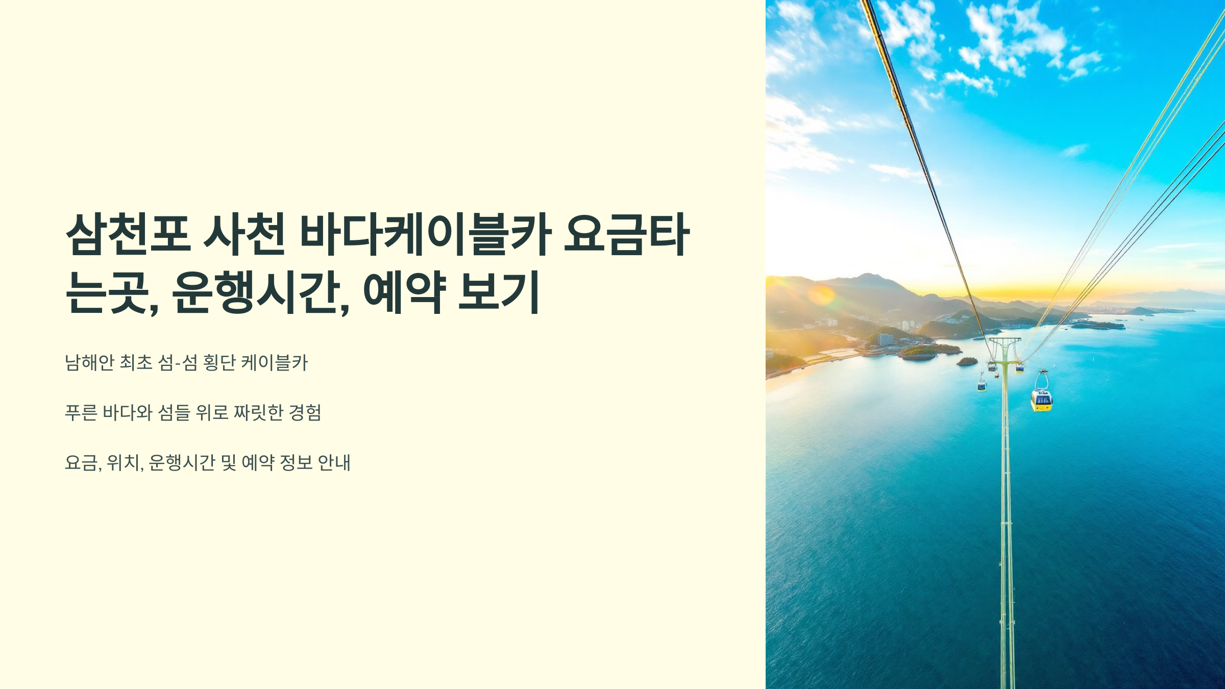 남해안의 아름다운 풍경을 하늘 위에서 만끽할 수 있는 삼천포 사천 바다케이블카! 푸른 바다와 섬들을 잇는 짜릿한 경험은 많은 여행객들에게 잊지 못할 추억을 선사합니다. 오늘은 사천 바다케이블카의 요금, 타는 곳, 운행시간은 물론 예약 정보까지 전문가처럼 상세하게 알려드리겠습니다.