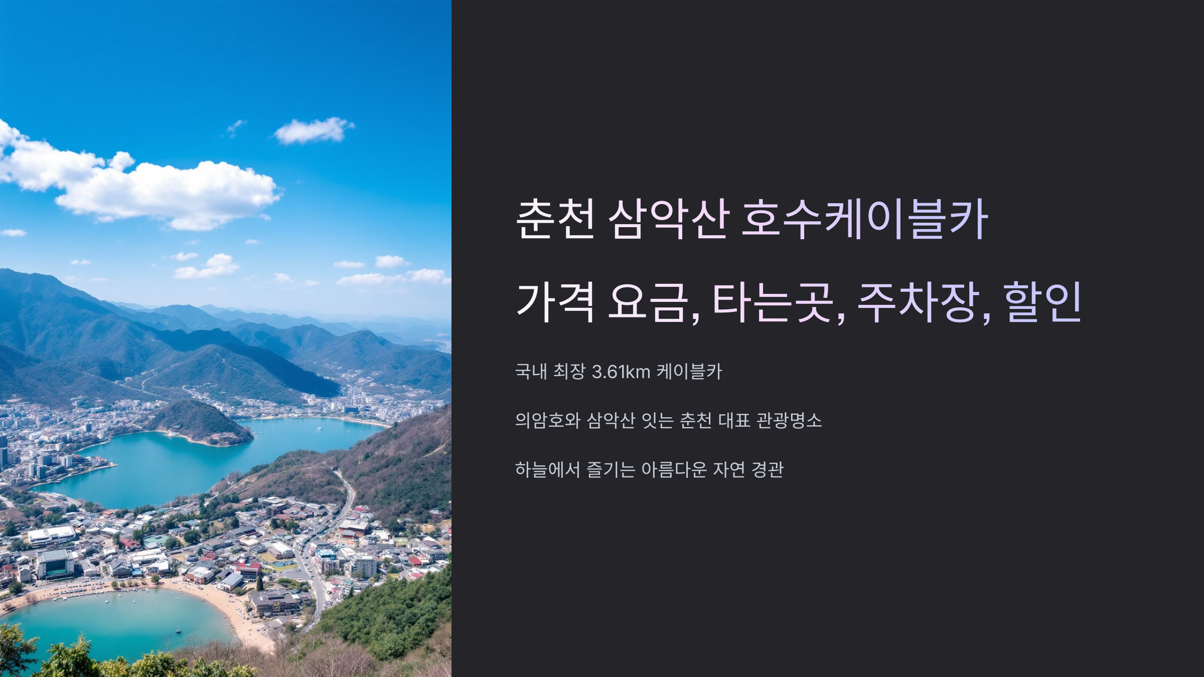 아름다운 의암호와 웅장한 삼악산을 잇는 춘천 삼악산 호수케이블카는 3.61km의 국내 최장 길이 케이블카로, 춘천의 대표적인 관광 명소입니다. 춘천의 아름다운 자연을 하늘 위에서 만끽할 수 있어 많은 관광객들의 발길이 끊이지 않는데요. 삼악산 호수케이블카의 가격, 타는곳, 주차장 정보는 물론 다양한 할인 혜택까지, 춘천 여행을 계획하는 여러분을 위해 전문가가 상세하게 안내해 드립니다.